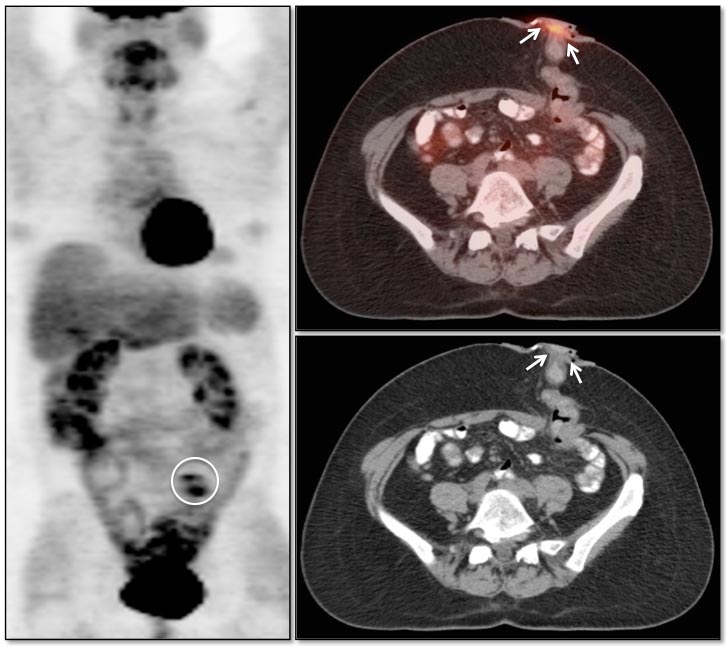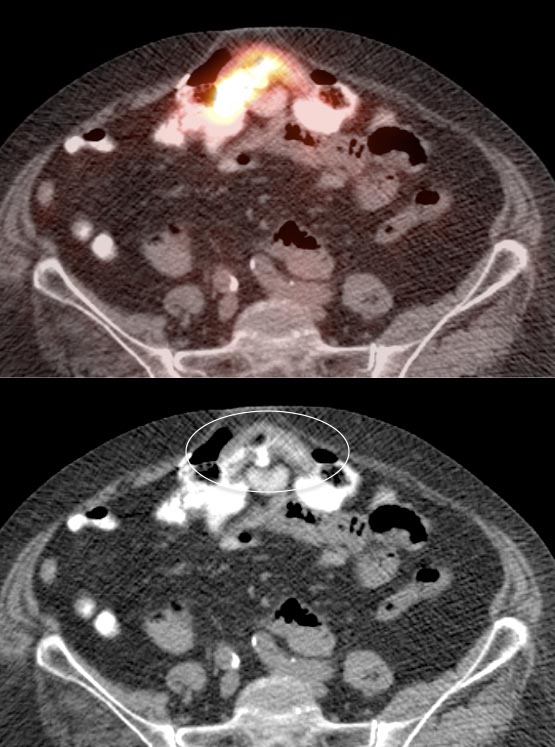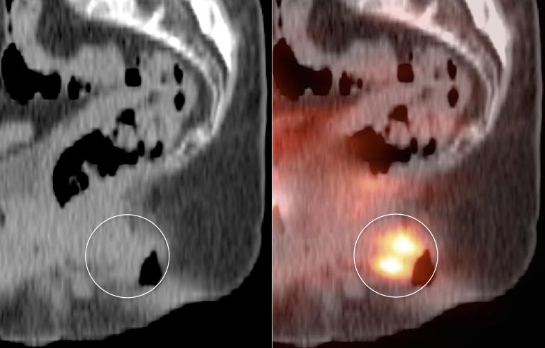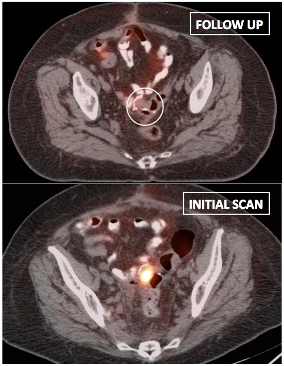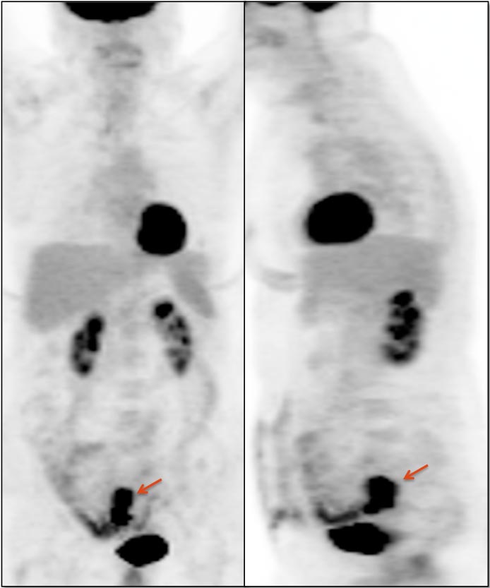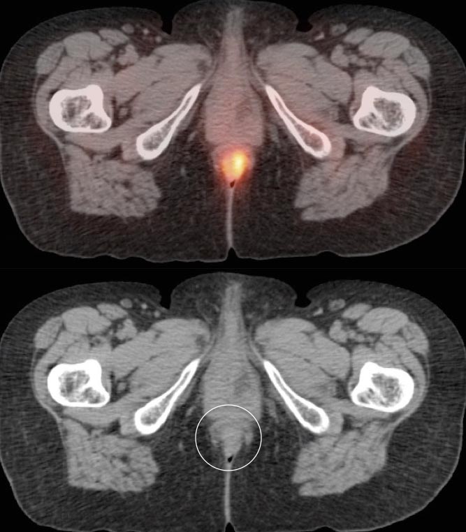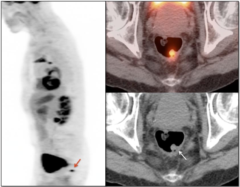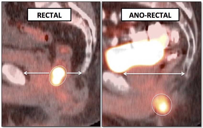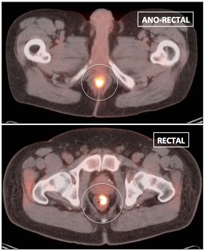 Be careful to not confuse ano-rectal uptake (typically representing hemorrhoidal inflammation) with rectal uptake (often malignancy).