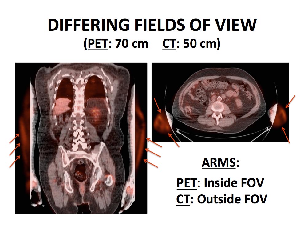 - Portions of the body (typically the arms, if scanned in the down position), may only be seen on the PET images, without CT image correlation.