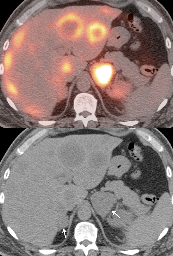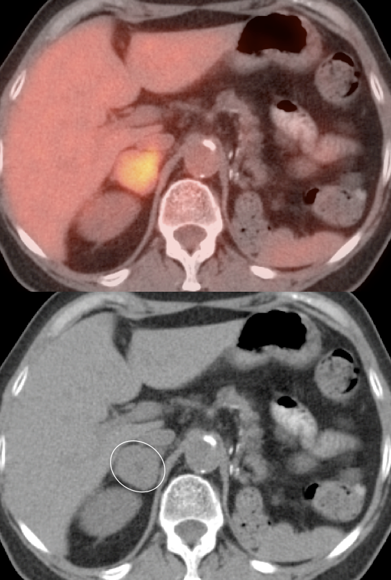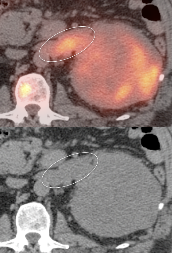 - Nearly every PET/CT scan is performed without intravenous contrast, markedly limiting evaluation of the kidneys on the CT portion of the exam.