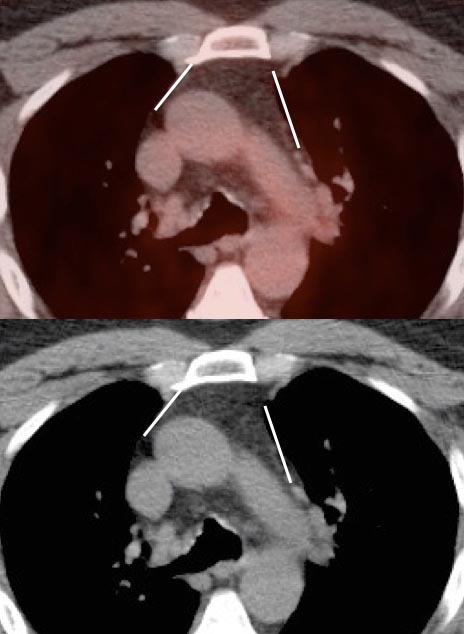 Resulting from incomplete fetal migration, a soft tissue nodule can be seen adjacent to the left brachiocephalic vein. In cases where the thymus is hypermetabolic, this nodule may also be FDG-avid (should be of similar intensity on PET and of similar density on CT).