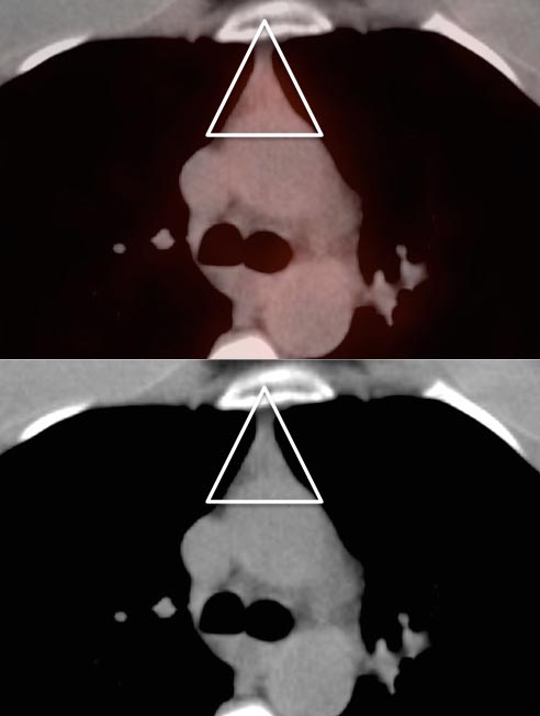 - Before considering any thymic uptake “normal”, it important that the thymus have a relatively normal CT appearance — somewhat triangular on the axial and coronal views, with straight or concave borders.