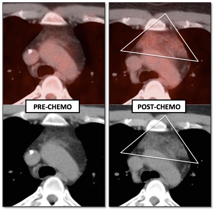 The enlarged gland should largely maintain its normal triangular configuration, without significant mass effect on the antero-lateral borders of the anterior mediastinum (“Thymic Rebound Hyperplasia” is discussed in greater detail, here).
