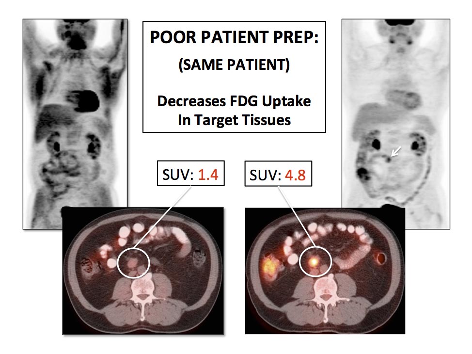 Essentially, elevated plasma glucose will compete with FDG (a glucose analog), decreasing tumoral uptake.  Elevated glucose also stimulated insulin production, driving glucose (and FDG) into muscle.  Recent strenuous exercise also drives FDG into skeletal muscle.   Ultimately, excessive skeletal muscle uptake, irrespective of etiology, both decreases available FDG for tumor uptake (decreasing tumor SUV) and potentially obscures lesions within or adjacent to this hypermetabolic muscle. [FIG. 1]   [FIG. 2]