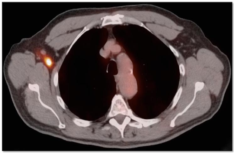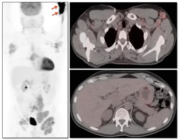 This extravasated FDG can cause false positive uptake in adjacent nodes and vessels (discussed here).  Additionally, the resulting decrease in available FDG for circulation in the body (and absorption into tumors) can lead to false negative results (the “Sponge Effect”, discussed here). [FIG. 5]   [FIG. 6]