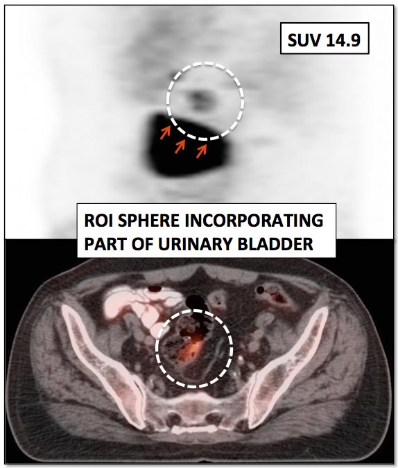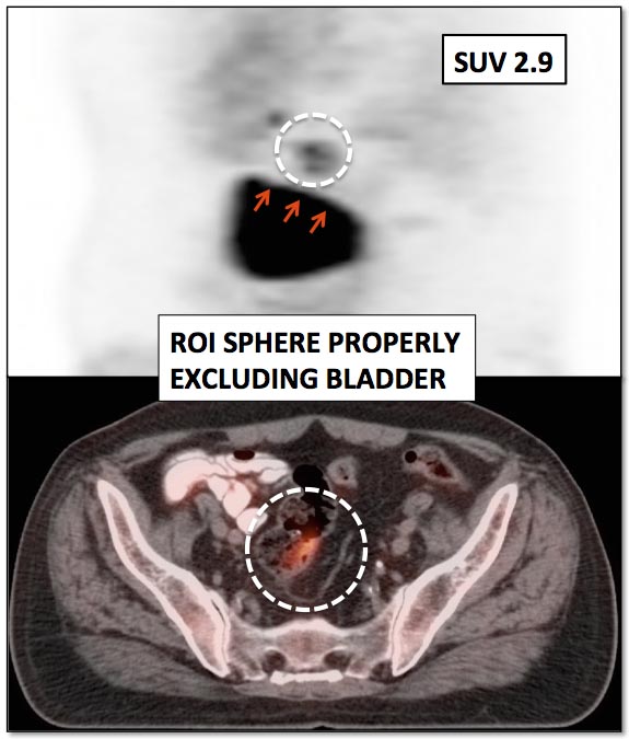 It is very easy to inadvertently include adjacent hypermetabolic structures in an ROI (frequently seen with lesions next to the heart, bladder, liver or brain), falsely increasing the measured SUV.  [FIG. 8]  [FIG. 9]