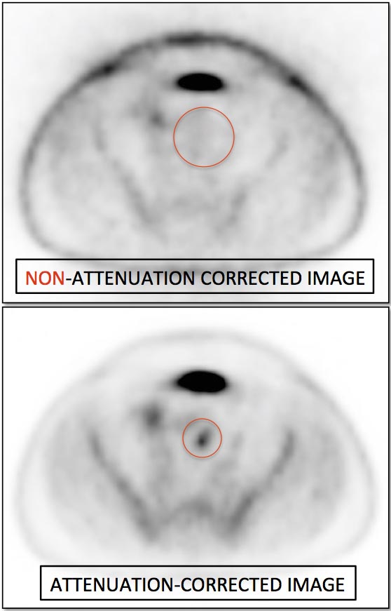On occasion (typically in older PET/CT machines), attenuation correction of PET images can result in falsely elevated metabolic activity in regions of high CT density (e.g. metallic devices, oral contrast, calcification).  In such cases, these areas must be reviewed on the NAC (non-attenuation correction) images. If these regions are not also hypermetabolic on the NAC images, then their apparent increased FDG-uptake on the AC images is artifactual.  [FIG. 10]   [FIG. 11]